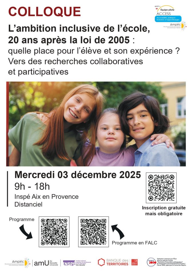 Ce colloque se déroulera le Mercredi 3 décembre 2025, de 9h à 18h en présentiel à l’Inspé d’Aix-Marseille (site d’Aix-en Provence - 2 av. J. Isaac) et à distance.