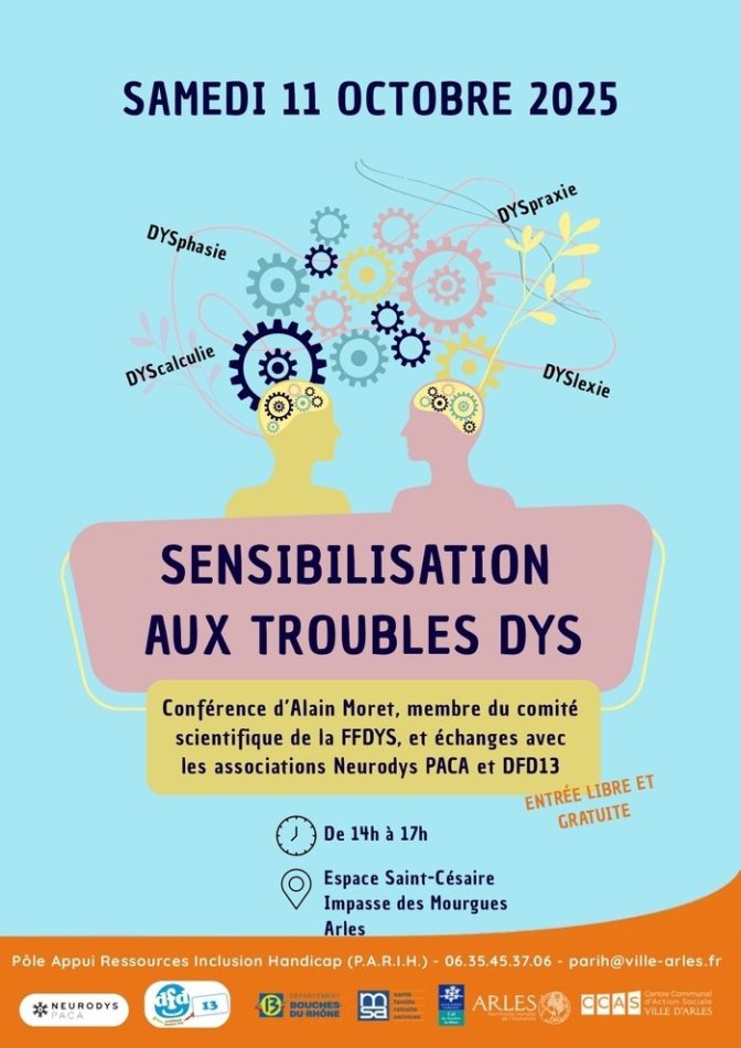 Le Pôle d’Appui et de Ressouces Inclusion Handicap (PARIH) et le service inclusion handicap du service des écoles de la ville d’Arles organisent un temps de rencontre sous forme de conférence et d’échange dans le cadre de la journée nationale des troubles DYS.