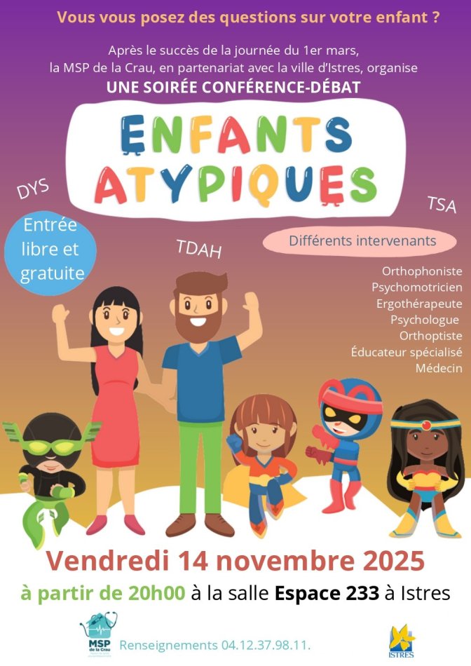 La Maison de Santé Pluriprofessionnelle de la Crau, en partenariat avec la ville d’Istres, organise une soirée de conférence-débat pour les Enfants atypiques.